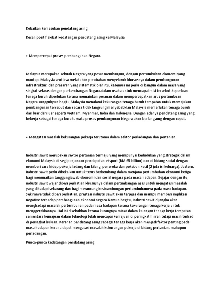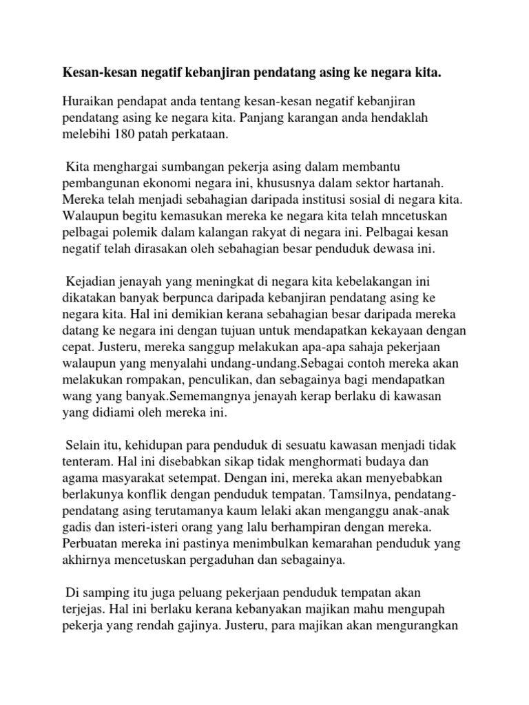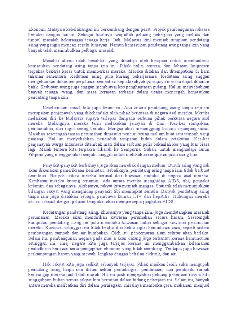 Karangan Bm from imgv2-2-f.scribdassets.com Masalah sosial pendatang asing tanpa izin mp3 & mp4. Pendatang asing tanpa izin (pati), pendatang tanpa izin (pti) atau pendatang haram merupakan golongan orang yang masuk atau tinggal di sesebuah negara secara haram. Sudah terang lagi bersuluh, kemasukan pekerja asing tanpa kawalan menyebabkan peningkatan kadar jenayah di negara ini. Hubungan mereka secara seksual dengan pelacur tempatan akan mempercepat jangkitan aids. Berikut dikongsikan contoh karangan kesan kemasukan pendatang asing dan cara mengawalnya untuk panduan semua. Kerajaan malaysia melancarkan pelan rekalibrasi pendatang asing tanpa izin (pati) merangkumi dua komponen utama. Jika ada majikan, majikan sila bawa Banyak pendatang asing tanpa izin juga disahkan sebagai pembawa kuman hiv dan hepatitis.