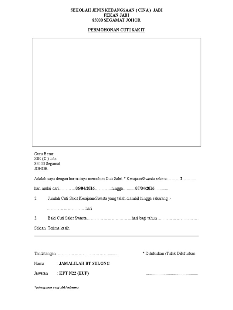 3 bersama sama surat ini saya sertakan sesalinan surat cuti. Sijil cuti sakit syarat untuk mendapat mc menjaga anak yang sakit theasianparent malaysia. Jumlah cuti sakit sama ada berasaskan sijil sakit swasta atau sijil sakit kerajaan yang boleh diberikan adalah tidak melebihi 180 hari dalam sesuatu tahun kalendar, di mana 90 hari pertama boleh diluluskan oleh ketua jabatan dan 90 hari seterusnya hendaklah diluluskan oleh ketua setiausaha. Tempoh pegawai perlukan cuti kerana sakit : Pelbagai cop doktor dan sijil cuti sakit daripada klinik swasta dan kerajaan yang dirampas. < contoh soalan bahasa melayu tingkatan 1 2019 cucu raja salman arab saudi cuti hari raya puasa 2017 contoh surat melalui ketua jabatan cuti umum random posts. Mc boleh diperolehi daripada doktor kerajaan ataupun swasta. Penambahbaikan dasar mengenai penerimaan sijil sakit yang. Di dalam pasal 81 ayat (1) tertulis jelas bahwa karyawan perempuan yang dalam masa haid merasakan sakit dan. Enam operator kilang dihadapkan di mahkamah majistret, di sini, hari ini, atas pertuduhan memalsukan sijil cuti sakit yang dilakukan mereka pada oktober. Walaubagaimana pun cuti sakit swasta + kerajaan tidak lebih 180 hari (90 hari pertama ketua jabatan & 90 hari berikutnya kuasa tertentu). Borang permohonan cuti sakit ums edu my universiti. Senarai semak fail kursus pensyarah universiti malaysia sabah.