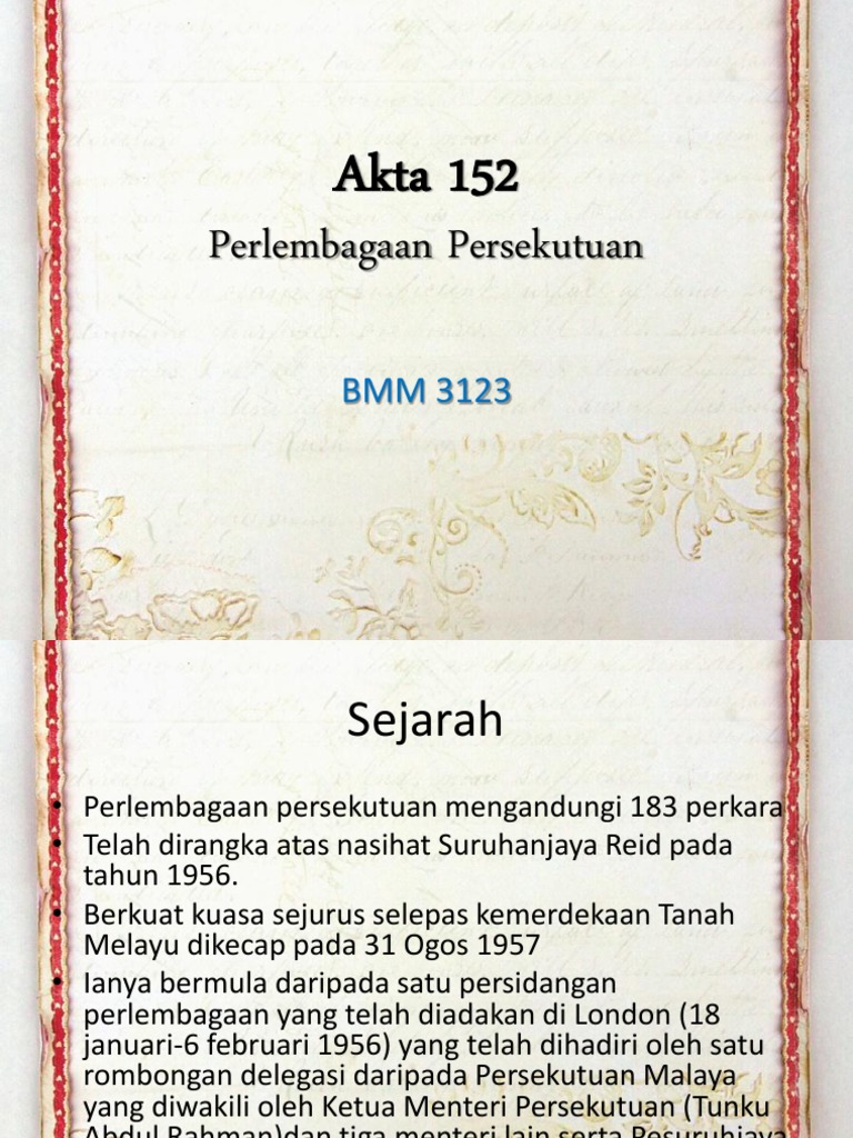 Bahasa malaysia telah diiktiraf dalam perkara 152 (1) perlembagaan persekutuan yang digunakan oleh semua masyarakat dalam semua urusan seharian. Diperkenalkan pertama kali sebagai perlembagaan persekutuan tanah melayu pada hari kemerdekaan : Dengan itu undang2 perlembagaan 1948 terbatal, tetapi sesiapa yang telah menjadi wargenegaraan mengikut perjanjian 1948, terus. Perkara 152, perlembagaan malaysia memperuntukkan bahasa kebangsaan di malaysia ialah bahasa melayu. Perkara 152 perlembagaan persekutuan merujuk kepada. Asas perlembagaan persekutuan malaysia ialah perlembagaan persekutuan tanah melayu. Perlembagaan malaysia termasuk dalam perlembagaan jenis. Bahasa melayu perkara i52 perlembagaan persekutuangroup ctu 553 '17pensyarah: Bahasa kebangsaan telah diputuskan dalam perlembagaan persekutuan iaitu bahasa melayu sebagai bahasa kebangsaan. Perkara 23 hingga perkara 28 perlembagaan persekutuan pula, menyenaraikan ciri yang berkaitan dengan kehilangan kewarganegaraan. Dalam perlembagaan persekutuan menyatakan perkara 3 ialah agama bagi persekutuan. Kemenangan parti perikatan dalam pilihanraya persekutuan pertama pada tahun 1955, tunku abdul rahman putra dipilih sebagai ketua menteri pertama. Seksyen 6 dan 13 akta prosedur kewangan 1957.